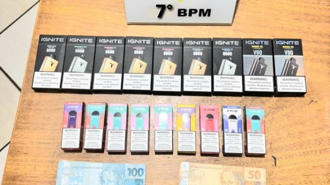 Durante a ação, foi realizada busca veicular, onde foi localizada, no porta-malas, uma sacola contendo 19 cigarros eletrônicos de marcas variadas e, sob a proteção do estepe, diversas cédulas em espécie, totalizando R$ 1.400,00.